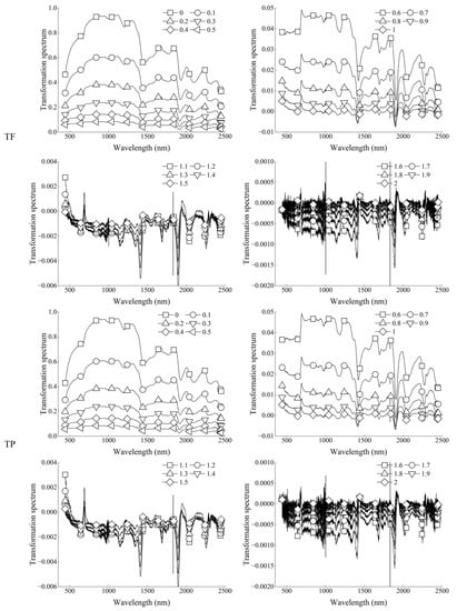 Figure 4 shows the spectral reflectance of the original spectrum (0 order) and 0.1~2 order (in steps of 0.1) FOD preprocessing. With the increase of order, the reflectance characteristics of the original spectral curve gradually disappeared. At the same time, FOD can show the change process from the original spectrum to the IOD spectrum. The main performance was that the value of spectral reflectance decreased gradually from order 0 to order 1.2, while the value of spectral reflectance increased gradually from order 1.3 to order 2.