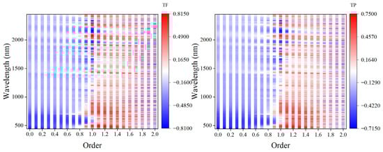 Figure 5 shows the correlation between FOD spectra and the content of total flavonoids and total phenols in grains. In the range of order from 0 to 0.9, the FOD spectra was mainly negatively correlated with the content of total flavonoids and total phenols, while in the range of order from 1 to 1.5, it was mainly positively correlated. In the range of order from 0.9 to 2, there was a trend of alternating positive and negative correlation, and this phenomenon was more obvious with the increase of order. In addition, the FOD can show the gradual process of the correlation between the FOD spectra and the content of total flavonoids and total phenols at the same wavelength.