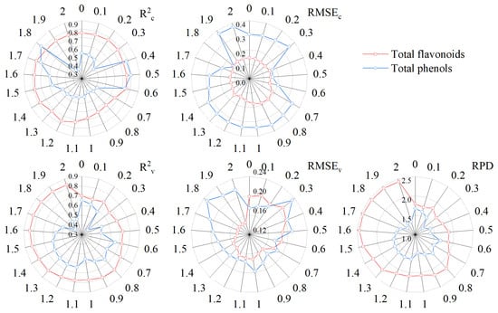 Figure 3 shows the accuracy of the model under the optimal number of latent variables. The calibration accuracy of the total flavonoids content model constructed based on different transformation spectra was not much different, with R2c distributed around 0.8 and RMSEc distributed around 0.15, and the calibration accuracy under SNV transformation was the highest. The calibration accuracy of the total phenols content model based on different transformation spectra was different, and the calibration accuracy reached the highest under FD transformation. Different from the calibration accuracy, the total flavonoids content model achieved the best validation accuracy under SD transformation, and its RPD was 2.1462. The total phenols content model achieved the best validation accuracy under FD transformation, and its RPD was 1.8001. It can be seen that the total phenols content model obtained the best model under FD transformation. The model of total flavonoids content reached the highest validation accuracy in SD transformation, but its calibration accuracy also had a high level at this time, so SD can be used as the best preprocessing algorithm of total flavonoids content. It can be concluded that when the total flavonoids content and total phenols content models reached the best accuracy, the preprocessing algorithm used was derivative preprocessing. However, the FD and SD preprocessing cannot reflect the process of the original spectrum changing to the IOD spectrum. Therefore, in the following, this study will continue to study the effect of FOD preprocessing on the accuracy of the total flavonoids content and total phenols content model.