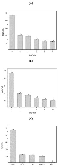 The bactericidal rate of each treatment was determined by the coated plate method after treating LM biofilm with three groups of bactericides for different times. The different letters indicate significant differences (p < 0.05). Data were expressed by mean measurements ± standard deviation (SD), and all treatments and determinations were performed in triplicate. (A) is the bactericidal rate of SAEW. (B) is the bactericidal rate of NEHW. (C) is the bactericidal rate of AEW and ALEW. SAEW was the abbreviation of slightly acidic electrolytic water, and NEHW was the abbreviation of non-electrolytic hypochlorite water. In A1S4, A2S8, S3A1S1, and S6A2S2 treatment, S stands for strongly acidic electrolytic water, A stands for strongly alkaline electrolytic water, and the number represents the action time.