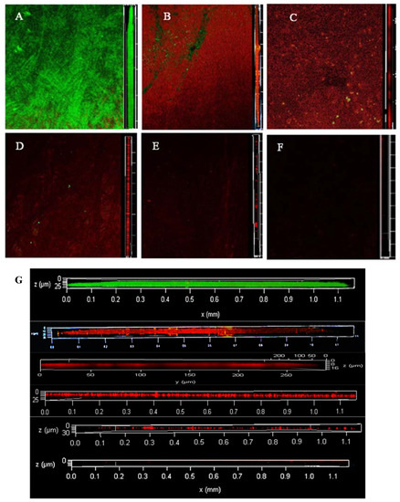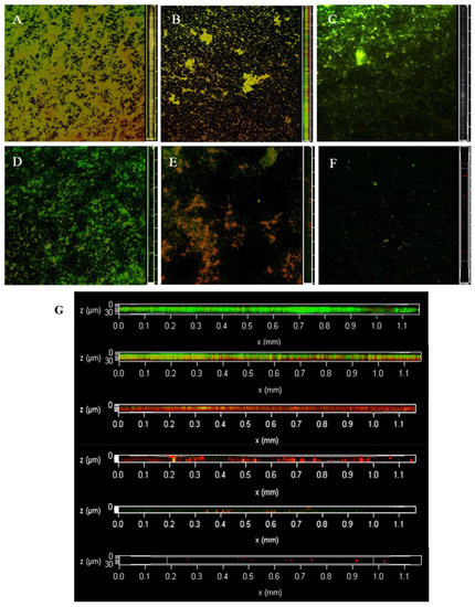 Quantifying surface biofilm formation is challenging because traditional microbial methods, which often rely on manual counting, are susceptible to human error. In contrast, the direct imaging of biofilms using microscopic techniques provides information about their structural characteristics, which in turn can determine whether interventions are successful in disrupting biofilm formation. Confocal laser scanning microscopy (CLSM) selectively excites fluorescent signals from different planes in the sample, acquiring images point-by-point under local laser excitation at specific wavelengths and allowing for 3D visualisation of the biofilm structure by excluding signals from adjacent planes. The second benefit of CLSM is the versatility offered by the fluorescent dyes added to the sample, which allows for the acquisition of additional information such as the presence of extracellular DNA, extracellular polysaccharides, and biofilm viability. Among the available fluorescent staining methods, live/dead staining is a traditional method for evaluating biofilm formation in microorganisms with a wide range of applications, including in oral, skeletal, and intestinal microorganisms [15,16]. In combination with live/dead staining, CLSM can be used to quantify biofilm viability on transparent and opaque surfaces. Additionally, in combination with extracellular polymer dyes, the dynamics of BFs during formation and clearance can be observed.