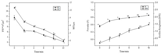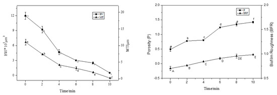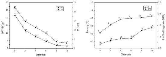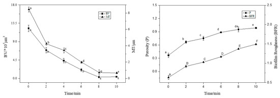 With an increase in treatment time (2–8 min), the BV and MT decreased significantly (p < 0.05), and the BF thickness decreased by 50% compared to the control (0 min) after 4 min of treatment. At 8 min of treatment, the average thickness was 0.2 μm and the average volume was 1.0 × 105 μm3; the average thickness and average volume of BF were extremely small, and the BV and MT decreased in rate. This trend was consistent with the sterilisation rate. Interestingly, the P and roughness coefficient increased with increasing action time, and the BFR of the BF was the largest at 10 min, indicating that the BF surface was not smooth and formed an uneven surface structure.