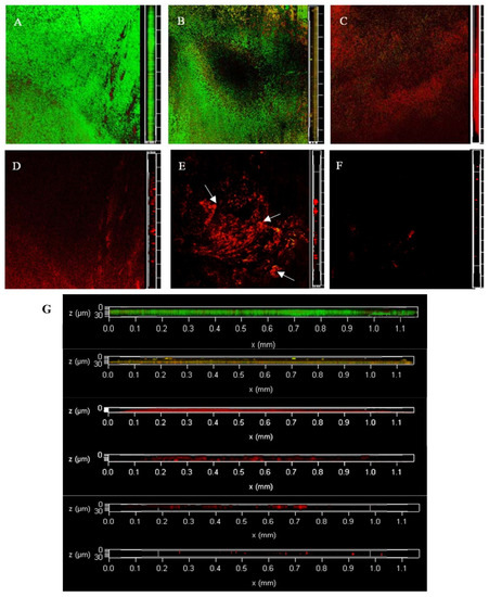 The changes of viable and dead colonies in LM biofilm after NEHW treatment observed by CLSM; each sample randomly selects three visual fields. Images include front and side views of the biofilm under CLSM. Scale bar—100 µm. (A–F) represent the dead or alive status of the remaining bacteria after 0, 2, 4, 6, 8 and 10 min of treatment, respectively. (G) is an enlarged version of all the images on the right and is also a right-hand view of the biofilm, from top to bottom, for NEHW treatments 0, 2, 4, 6, 8 and 10 min respectively. NEHW was the abbreviation of non-electrolytic hypochlorite water. Green—live cells, red—dead cells. The arrows point to areas of denser biofilm.