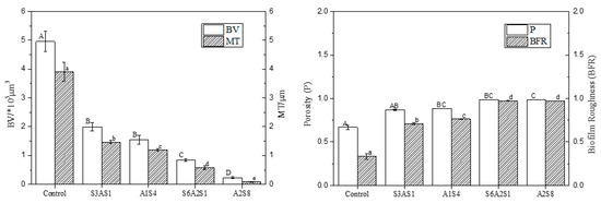 As illustrated in Figure 7, the BV and average thickness decreased with an increase in treatment time. The best removal effect was in the A2S8 treatment, where the average thickness of BF was 0.09 μm and the average volume was 0.2 × 105 μm3 after treatment. The BFR and P increased to 0.97 and 0.99, and the MT and BV of the BF were extremely small.
