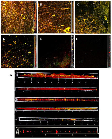 - Alhede, M.; Qvortrup, K.; Liebrechts, R.; Høiby, N.; Givskov, M.; Bjarnsholt, T. Combination of microscopic techniques reveals a comprehensive visual impression of biofilm structure and composition. FEMS Immunol. Med. Microbiol. 2012, 65, 335–342. [Google Scholar] [CrossRef] [PubMed]