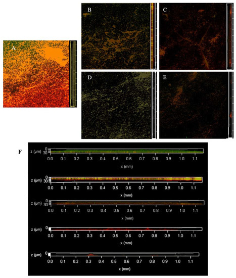 The changes of eDNA and eRNA in LM biofilm after AEW and ALEW treatment observed by CLSM; each sample randomly selects three visual fields. Images include front and side views of the biofilm under CLSM. Scale bar—100 µm. (A) is control, (B) is S3A1S1 treatment, (C) is A1S4 treatment, (D) is S6A2S2 treatment, and (E) is A2S8 treatment. (F) is an enlarged version of all the images on the right and is also a right-hand view of the biofilm, from top to bottom, for AEW and NEHW treatments 0, 2, 4, 6, 8 and 10 min respectively. AEW was acidic electrolytic water, and ALEW was alkaline electrolysed water.