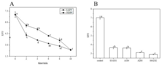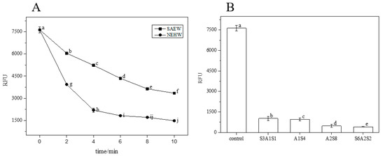 The RFU of residual eDNA content in each treatment. (A) is the RFU of residual eDNA after SAEW and NEHW treatment. (B) is the RFU of residual eDNA after AEW and ALEW treatment. The different letters indicate significant differences (p < 0.05). Data were expressed by mean measurements ± standard deviation (SD) and all treatments and determinations were performed in triplicate.