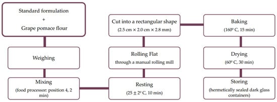 The ingredients (total of 250 g) were weighed on a digital scale (Precisa BJ 1100D, Dietikon, Switzerland) and mixed in a food processor (Vorwek, Wuppertal, Germany) at position 4 for 2 min until a consistent and homogeneous dough was obtained. Subsequently, the dough was flattened in a manual rolling mill (Atlas Marcato, 150, Campodarsego, Italy) at positions 2, 4 and 6. This step was repeated three times for each position. Afterwards, the dough was cut into a rectangular shape (2.5 cm × 2.0 cm × 2.8 mm) and it was left to rise at 25 °C 2 °C for 10 min. The baking process took place in a forced air convection oven (Arianna Unox, Padua, Italy) at a temperature of 160 °C for 15 min. Finally, the crackers were dried in an electric oven (Arianna Unox, Padua, Italy) at a temperature of 60 °C for 30 min and then cooled at 25 °C 2 °C. After the confection process, the crackers were stored in dark glass containers, hermetically sealed, and properly identified. Each formulation was prepared in triplicate in approximate batches of 60 units. Production process can be seen in Figure 1.