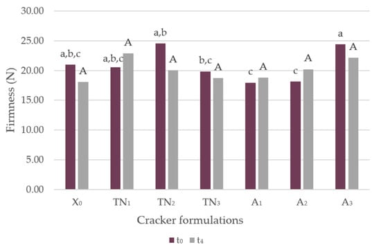 Firmness (N) of the savory crackers at t0 and t4. Different letters correspond to significant differences (ANOVA test Tukey, p < 0.05). Abbreviations: X0, control sample; TN1, Touriga Nacional with 5% incorporation; TN2, Touriga Nacional with 10% incorporation; TN3, Touriga Nacional with 15% incorporation; A1, Arinto with 5% incorporation; A2, Arinto with 10% incorporation; A3, Arinto with 15% incorporation; t0, day of confection; t4, 4th week after confection. The lower cases letters correspond to t0 and the capital letters correspond to t4.