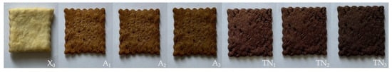 Control and 5%, 10% and 15% GPF-incorporated crackers from two different grape varieties. Abbreviations: X0, control sample; TN1, Touriga Nacional with 5% incorporation; TN2, Touriga Nacional with 10% incorporation; TN3, Touriga Nacional with 15% incorporation; A1, Arinto with 5% incorporation; A2, Arinto with 10% incorporation; A3, Arinto with 15% incorporation.