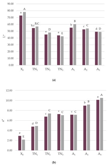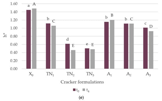 Color parameters L* (a), a* (b), b* (c), C* (d) and h* (e) of the savory crackers, at t0 and t4. Different letters correspond to significant differences (ANOVA test Tukey, p < 0.05). Abbreviations: X0, control sample; TN1, Touriga Nacional with 5% incorporation; TN2, Touriga Nacional with 10% incorporation; TN3, Touriga Nacional with 15% incorporation; A1, Arinto with 5% incorporation; A2, Arinto with 10% incorporation; A3, Arinto with 15% incorporation; t0, baking day; t4, 4th week after baking; L*, lightness; a*, yellowness; b*, greenness; C*, chroma; h*, hue. The lower cases letters correspond to t0 and the capital letters correspond to t4.