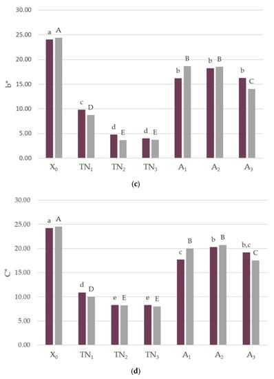 Overall, as far as color coordinates are concerned, it can be stated that a reduction in L* and h* values was observed. Pertaining to saturation, color stability was displayed upon a 10% incorporation level. These results are supported by studies that evaluated colorimetric parameters in cookies with grape flour incorporated at levels between 5% [] and 40% [].