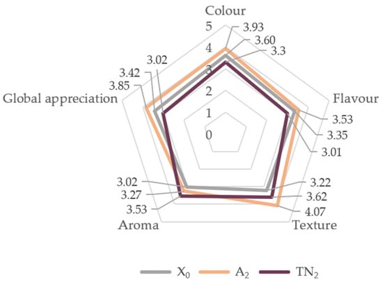 Sensory analysis (n = 60) of the savory crackers, concerning color, aroma, flavor, texture and global appreciation parameters. 1—“very unpleasant”; 2—“unpleasant”; 3—“indifferent”; 4—“pleasant”; 5—“very pleasant”. Abbreviations: X0, control sample; TN2, Touriga Nacional with 10% incorporation; A2, Arinto with 10% incorporation.