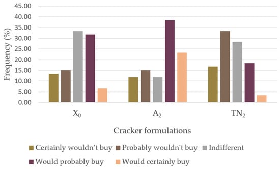Figure 6 represents the panelists’ buying intention. The majority (65%) of the participants stated that they were indifferent or would probably buy the X0 cracker formulation. An A2 preference was noted by the panel, given that 61.6% would certainly/probably buy. Regarding TN2, 61.6% of the individuals indicated that they were indifferent or that they probably would not buy.