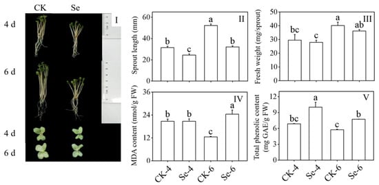 Effect of exogenous selenium on growth performance (I), sprout length (II), fresh weight (III), malondialdehyde content (IV), and total phenolic content (V) of broccoli sprouts during germination. Each data point represents the average of three independent biological replications (average ± SD). Lowercase letters reflected the significance of differences in indexes among treatments at different germination times using Tukey’s test (p < 0.05). For example, CK-4, Se-4, CK-6 and Se-6 indicated the 4- and 6-day-old broccoli sprouts treated with distilled water and 0.10 mM Na2SeO3, respectively.