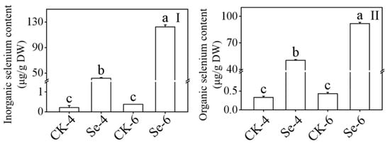 Effect of exogenous selenium on inorganic selenium content (I) and organic selenium content (II) of broccoli sprouts during germination. Each data point represents the average of three independent biological replications (average ± SD). Lowercase letters reflected the significance of differences in indexes among treatments at different germination times using Tukey’s test (p < 0.05). For example, CK-4, Se-4, CK-6 and Se-6 indicated the 4- and 6-day-old broccoli sprouts treated with distilled water and 0.10 mM Na2SeO3, respectively.