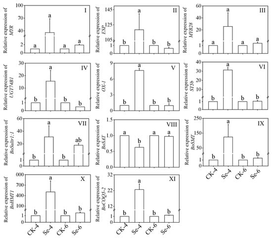Changes of MYR (I), ESP (II), MYB28 (III), UGT74B1 (IV), OX-1 (V), ST5b (VI), BoSultr1;1 (VII), BoSAT (VIII), BoSMT (IX), BoHMT1 (X), and BoCOQ5-2 (XI) relative expression in broccoli sprouts under selenium treatment during germination. Each data point represents the average of three independent biological replications (average ± SD). Lowercase letters reflected the significance of differences in indexes among treatments at different times using Tukey’s test (p < 0.05). For example, CK-4, Se-4, CK-6 and Se-6 indicated the 4- and 6-day-old broccoli sprouts treated with distilled water and 0.10 mM Na2SeO3, respectively.