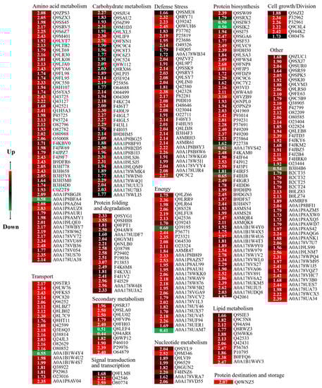 In this study, these DAPs could be classified into 14 functional classes based on the molecular functions listed on the UniProt and KEGG websites, i.e., amino acid metabolism, carbohydrate metabolism, cell growth/division, defende/stress, energy, lipid metabolism, nucleotide metabolism, protein biosynthesis, protein destination and storage, protein folding and degradation, secondary metabolism, signal transduction, and transcription, transport and other (Figure 6I). After four days of germination in Na2SeO3, the abundance of all DAPs in the carbohydrate metabolism, cell growth/division, defende/stress, lipid metabolism, nucleotide metabolism, protein destination and storage, protein folding and degradation, and signal transduction classes increased significantly (Figure 6II).