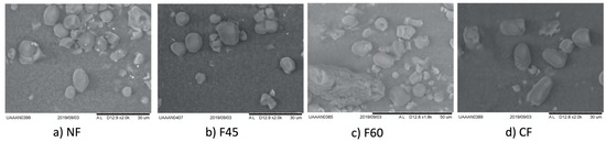 Figure 2 shows the scanning electron micrographs of MNF. The particles observed in all the flours were round, oval, and irregular; these particles correspond to starch granules. These particles were expected to be observed since MNF has been reported to have a 61% starch content [