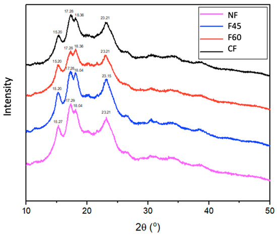 36]. All MNF exhibited a XRD starch pattern of type C crystals. In MNF, the XRD peaks with the highest intensity for the 2θ angles were 15°, 17°, 18°, and 23°, with minor peaks at 20° and 26°. The drying temperatures did not alter the flour’s crystalline structure, but it did reduce the diffraction intensity as shown by the shape and size of the crystalline peaks [