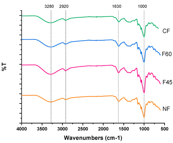 Figure 4. The signals showed similarity in the position of the bands obtained between the spectra of the flour samples, meaning that the drying methods did not affect the molecular structure of the flours and did not generate different compounds in them. The FTIR spectra show an absorption band at 3260 cm