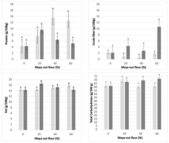 The carbohydrate concentration shows a significant increase as the amount of NF increases. This can be observed in CF cookies, which obtained the highest content (71.9 g/100 g) with 60% substitution; while using NF, the highest value of total carbohydrates occurs with 20% substitution of Maya nut flour (68.4 g/100 g).