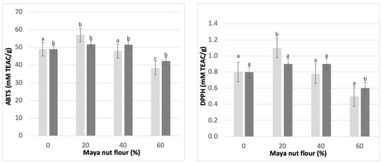 As discussed earlier, an important component of the Maya nut is its antioxidants. Therefore, to evaluate the stability of this antioxidant capacity when baking cookies, ABTS and DPPH tests were carried out. The results are shown in