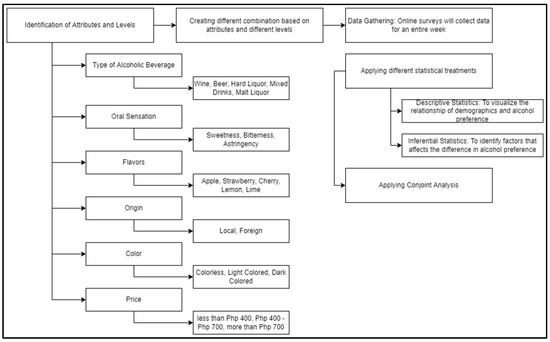 This study mainly comprises three (3) significant phases, as seen in Figure 1. The first phase reviews the possible attributes and levels considered in alcohol consumption based on the customer’s perspective. From this, possible combinations or alternatives of attributes called stimuli are generated by applying Conjoint Analysis. This information will be used in the online survey distributed by the researchers for its final phase. Due to the current circumstances, this study used purposive sampling techniques to gather data from respondents through online surveys. Additionally, according to Sethuraman et al. [25], an online survey is proven to be more effective in gathering data for a conjoint study.