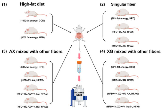 Twenty-eight 6-week-old male ICR/KM mice were housed in separate cages through an adaptive feeding period of 1 week, and then, they were randomly divided into seven groups: normal-diet group (10% fat energy, CON), high-fat diet group (60% fat energy, HFD), high-fat-diet group complemented with AX (8% AX, HFAX), high-fat-diet group complemented with XG (8% XG, HFXG), high-fat-diet group complemented with AX and BG (4% AX + 4% BG, HFAβ), high-fat-diet group complemented with AX and XG (4% AX + 4% XG, HFAG), and high-fat-diet group complemented with XG and inulin (4% XG + 4% inulin, HFXI), as shown in Figure 1. After 8 weeks, the mice were fasted for 12 h, then sacrificed by cervical dislocation, and their abdominal cavity was immediately opened. The contents of the cecum were collected and kept in a refrigerator at −80 °C for analysis.