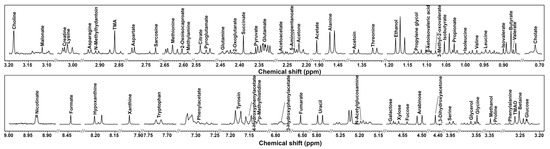 1 H-NMR spectrum of cecum contents in mice. Molecule names that appear over the signal were used for their quantifications. For each portion, a spectrum with a convenient signal-to-noise ratio has been selected in order to ease the reader’s visual inspection.
