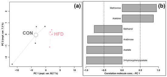 As shown in Figure 3a, PC 1 accounted for as much as 92.7% of the entire samples’ variability represented by the model, nicely summarizing the changes between the groups. In detail, the cecum contents of the HFD group were found to be mainly characterized by lower levels of methanol, arabinose, acetate, and 3-hydroxyphenylacetate and a higher level of methionine and acetone compared to the control CON group.