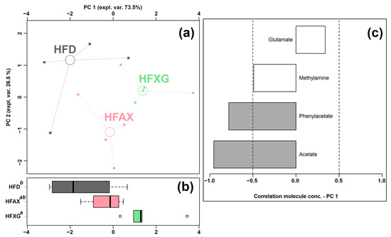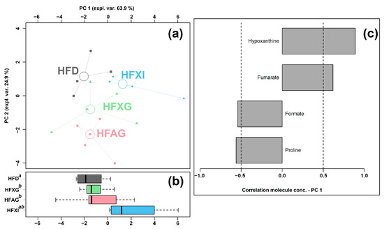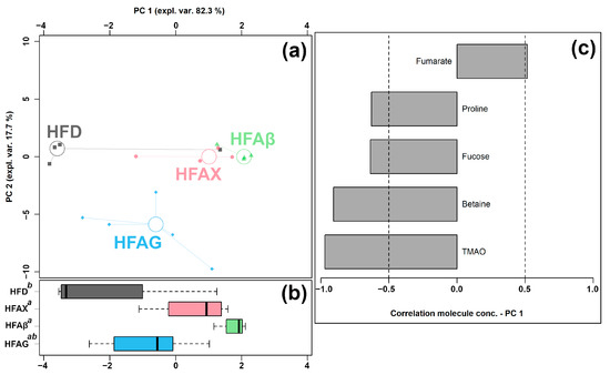 rPCA model was performed on the basis of molecules whose concentrations showed significant differences among HFD, HFXG, and HFAX groups. Scoreplot (a) shows the overall structure of the data, boxplot (b) highlights the position of the samples along PC 1, and loading plot (c) shows the relationships between the concentration of each molecule and its importance over PC 1. Gray bars highlight significant correlations (p < 0.05).