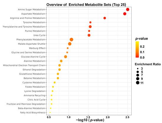 Enrichment analysis was performed using MetaboAnalyst 5.0. The result of the enrichment analysis highlighted the pathways mainly altered. For this purpose, we only considered molecules with significantly different concentrations in the univariate analysis.