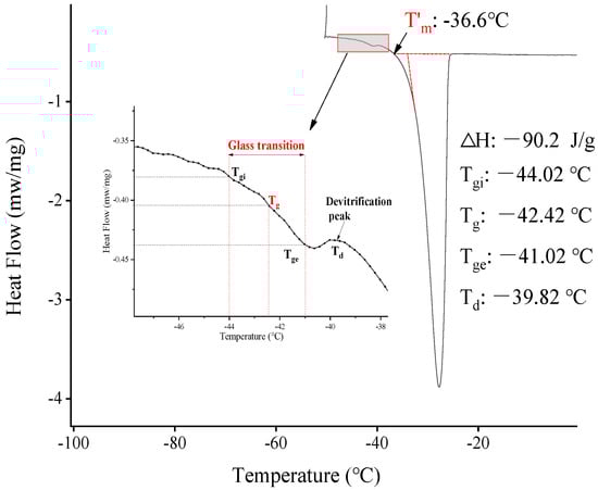 The differential scanning calorimetry (DSC) diagram of fresh chestnut kernels without annealing is shown in Figure 1, which belongs to the typical flow rate curve of the sample containing freezable water, including glass transition, and devitrification peak. The glass transition was the step phase of the curve and is enlarged in Figure 1. It is widely known that the glass transition temperature (Tg) plays a crucial role in freezing food and maintaining its stability. Tg depends primarily on the amount of water, as well as the composition and molecular weight of the solutes in the food []. The initial (Tgi), mid (Tg, −41.02 °C), and end-points (Tge) of the glass transitions of chestnut are shown in Figure 1. The onset of ice melting was found at Tm’ (−36 °C), which was also the end point of freezing, indicating all possible freezable water formed ice during cooling. The enthalpy of ice melting for chestnut containing freezable water (0.43 g water/g sample) was ∆H = −90.2 J/g. Furthermore, as rapid cooling led to partial freezing of the solution, the fluidity of the water molecules led to the recrystallization of the water in the amorphous matrix during the heating process. The devitrification temperature (Td) was observed at Td (−39.82 °C). These thermal transition characteristics of the chestnut kernels are similar to those of other fresh fruits, such as mango [] and date syrup [].