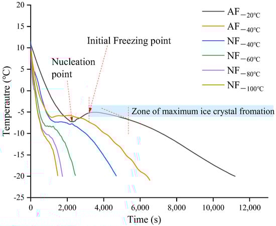 Figure 2 shows the freezing curves of chestnut kernels under various freezing methods, similar to that of polar solution. This is mainly because food contains a large number of non-water matters []. The freezing process of chestnut kernels consisted of pre-cooling (rapid cooling), phase transition, and quenching. At the pre-cooling stage, rapid cooling occurred with a relatively steep freezing curve. At the phase transition stage, which refers to the maximum ice crystal generation zone, the free water was converted into ice with more heat to remove. At this stage, the temperature changed within only several degrees with a gentle slope of the curve, and it was also a relatively gentle section in the curve. In the AF−20 °C treatment group, the curve at the phase transition stage was the gentlest and longest, while in the NF−100 °C treatment group, the curve was the shortest. The reason is that the heat transfer coefficient of NF (100 W/m2K) was far larger than that of AF (5 W/m2K) []. The initial freezing point of chestnut kernels decreased with the decrease in freezing ambient temperature, which was mainly affected by the freezing rate and the initial characteristics of materials. During the freezing process, with the release of latent heat, the freezing point declined slowly, indicating that the freezing concentration effect occurred. The differences between NF and AF appeared mainly at the phase transition and quenching stages. It revealed that the differences in the quality change in frozen chestnut kernels were mainly caused by the differences in freezing rate and heat transfer temperature as well as the mechanical pressure suffered by ice crystals.