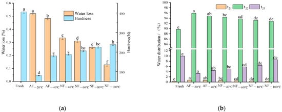 Effects of different freezing treatments on the (a) water loss and hardness; (b) water distribution of chestnut kernels. Note: In each figure, different letters mean significant differences (p < 0.05).