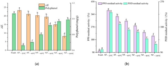 Effects of different freezing treatments on the (a) color and polyphenol content; (b) PPO and POD residual activity of chestnut kernels. Note: In each figure, different letters mean significant differences (p < 0.05).