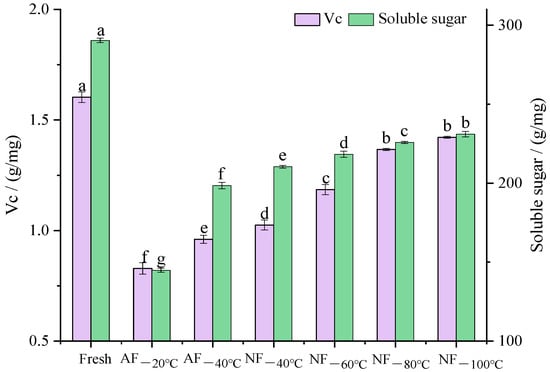 Effects of different freezing treatments on the Vc and soluble sugar of chestnut kernels. Note: In each column, different letters mean significant differences (p < 0.05).