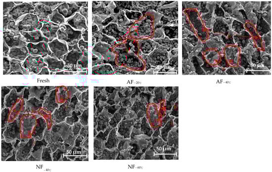 The tissue structures of sections of fresh chestnut kernels were plump and the cells were closely arranged, as is shown in Figure 6. There were obvious differences in cellular structures and arrangement between the quick-freezing groups and the slow-freezing groups after different treatment methods. The former can better maintain the cellular structures than the latter. According to the analysis of the Confocal Laser Scanning images of mangoes conducted by Charoenrein and Owcharoen [], after quick-freezing treatment, the cell walls remained round and were similar to those of fresh mangoes, while the slow-freezing treatment led to significant changes in cellular structures with lower uniformness. In the AF−20 °C treatment group with the lowest r value, the cells showed an obvious collapse with damaged structures in the cell walls and blurred cell boundaries. When the freezing temperature was lowered, long linear gaps appeared between holes in the AF−40 °C treatment group. This was because the r value remained low, which indicated slow freezing and caused the water within cells to flow to intercellular space, forming large intercellular ice crystals [] and increasing the intercellular space. NF−40 °C showed narrower gaps between holes and a smaller collapse compared with AF−40 °C. When the treatment temperature dropped further, the cells at NF−60 °C showed slight shrinkage and smaller intercellular space. The tissue images for the NF−80 °C and NF−100 °C groups showed an obvious improvement. This may be because a higher freezing rate reduced the time of passing through the maximum ice crystal generation zone. The small ice crystals uniformly distributed in the tissues protected the tissue structures. Therefore, the ambient temperature of −80 °C may be a key point for the liquid nitrogen spray quick-freezing treatment of chestnut kernels. In the NF−100 °C group, the holes were denser, the tissue structures were plumper, and they were the most similar to fresh tissues. This was consistent with the change trends in related freezing characteristics and quality. This is similar to the results of the Ultrasound-Assisted Freezing research on potatoes conducted by Tian et al. []. In the treatment groups with the shortest time of passing through the maximum ice crystal generation zone, the SEM image showed denser cellular arrangement, while in the treatment groups with the longest time of passing through the maximum ice crystal generation zone, there existed cell collapse and shrinkage and poor quality of the frozen products. The microstructure changes in chestnut kernels were consistent with the heat transfer and freezing rates trends. It comprehensively proved that NF−100 °C was the best treatment method to protect the microstructures of chestnut kernels, followed by NF−80 °C, which was acceptable for frozen product quality.