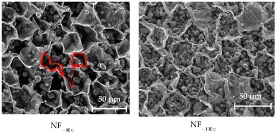 As is shown in Table 1, based on the total time of freezing (T) and the time of passing through the maximum ice crystal generation zone (Ti), groups were ranked as follows: AF−20 °C >> AF−40 °C >> NF−40 °C > NF−60 °C > NF−80 °C > NF−100 °C. Ti values in NF treatment groups were even lower than those in AF treatment groups. In the NF−40 °C and AF−40 °C treatment groups with the same ambient temperature, the Ti values of the former were 38% lower than those of the latter. This further suggests that the heat transfer performance of NF was significantly better than that of AF. When the temperature ranged from −40 °C to −100 °C, the lower ambient temperature for liquid nitrogen spray quick-freezing means lower T and Ti values. This is consistent with the research conducted by Cheng et al. [] on the liquid nitrogen spray quick-freezing of blueberries. In general, Ti directly affected the size and distribution of ice crystals as well as the microstructures of cell tissues. A lower Ti value needed a higher r value. The Ti in NF−100 °C was only about 270 s, equivalent to 1/8 of the Ti value in the AF−20 °C treatment group. This was consistent with the relationship between the two treatment groups in terms of average freezing rates. r values in the case of NF−100 °C were the highest. The r value in the NF−100 °C group was about seven times as high as that in the AF−20 °C group. A similar trend existed in the research performed by Tian et al. [] on the liquid nitrogen quick-freezing of cordyceps sinensis. In terms of the r value, NF was divided into two major categories: NF−80 °C~−100 °C (r ≈ 1) and NF−40 °C~−60 °C (r << 1). Higher r values meant a greater nucleation rate. The ice crystals were small and uniformly distributed in the food tissues, especially when the nucleation rate was higher than the growth rate of ice crystals. Their microstructures kept the initial state to a maximum extent after unfreezing. Therefore, from the perspective of heat transfer and freezing properties, the chestnut kernels treated with NF−100 °C presented the best microstructure quality, followed by the NF−80 °C treatment group with a freezing rate close to 1 °C/min.