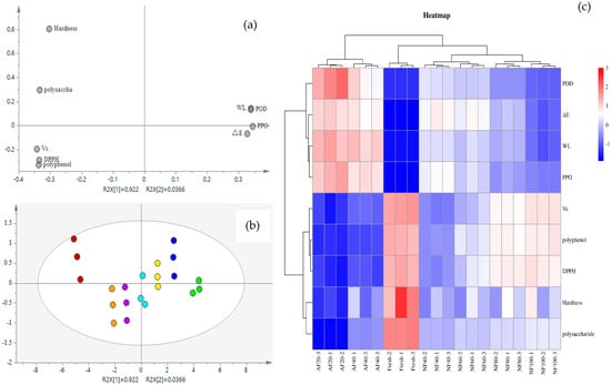 Loading scatter plot (a) and Score plot (b) of principal component analysis, and heatmap combined with the dendrogram of cluster analysis (c) were obtained based on the determined quality attributes.