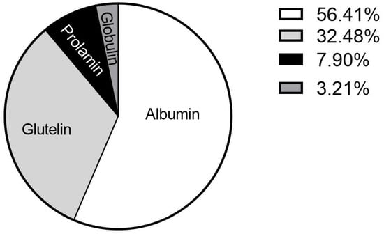The original powder was analyzed based on the Osborne Classification (Figure 3), and proteins were classified according to their solubility [26]. Our study revealed that in the Gryllus bimaculatus powder, 56.41% of the proteins were albumin (water soluble), 32.48% glutelin (alkaline pH soluble), 7.90% prolamin (ethanol soluble) and 3.21% globulin (saline soluble). In contrast to our results, Stone [27] showed that in Acheta domesticus protein concentrate, the most abundant proteins were albumin, with 31.5%, followed by globulin, prolamin and glutelin. This difference might be because the cricket analyzed in this study belongs to a different species. In another study of defatted cricket powder (Acheta domesticus), the second most abundant protein was glutelin, a result consistent with the one found in this study [28].