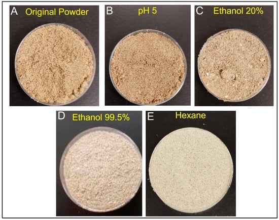 Pictures of the original powder and treated powders. (A) = original powder, (B) = pH 5 treated powder, (C) = ethanol 20% treated powder, (D) = ethanol 99.5% treated powder, (E) = hexane treated powder.