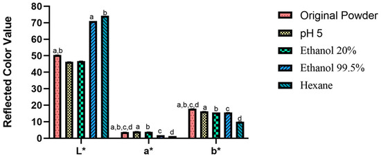 Difference in powder colors using CIELAB. Letters represent significant difference (p < 0.05). L*—a = ethanol 99.5% vs. original powder, b = hexane vs. original powder. a* and b*—a = pH 5 vs. original powder, b = ethanol 20% vs. original powder, c = ethanol 99.5% vs. original powder, d = hexane vs. original powder.