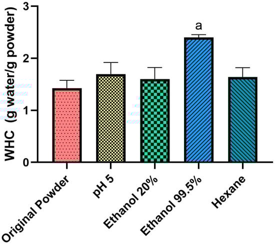 WHC is an important property since it is related to enhancing the palatability of food and changes its viscosity [48]. External factors can also affect the WHC, such as pH and temperature [50]. In our protocol, the powder treated with ethanol 99.5% was submitted to heat. Heating the powder can denature its proteins, but also improve the WHC [51]. Therefore, the increase in WHC might be explained not only by the defatting process, but also by the elevated temperature.