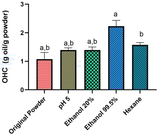 The values of OHC were shown in Figure 7. In the original powder, the OHC was low, with a value of 1.00 g oil/g powder.