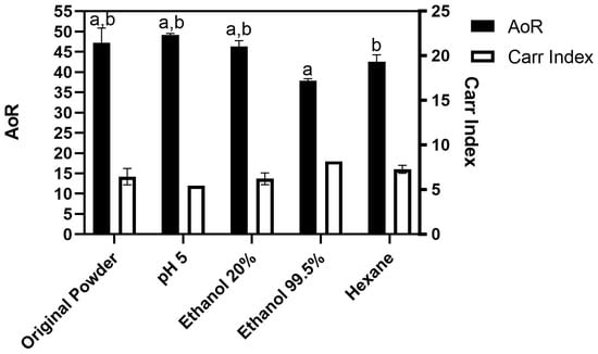 Evaluation of flowability using angle of repose (AoR). Letters represent significant difference (p < 0.05). a = Ethanol 99.5% vs. original powder, pH 5, and ethanol 20%. b = hexane vs. original powder, pH 5, and ethanol 20%. Carr index classification ranges from 0 to 25, in which 0–4.5 is very bad, 5–9.5 is bad, 10–14.5 is not good, 15–17 is normal, 17.5–19.5 is good, 20–22 is fairly good and 22.5–25 is very good flow. Classification of flowability according to Carr Index. (Hosokawa Powder Tester Model PT-X Operating Manual, Page D-53).
