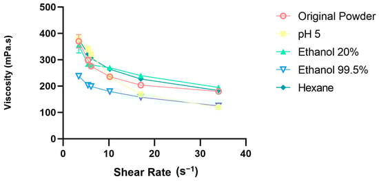 Figure 9 shows the viscosity of the paste made with the powders. The viscosities started around 375 mPa.s and decreased to around 150 mPa.s as the shear rate increased. The viscosity of all the treated powders was similar, except for the powder treated with ethanol 99.5%, which had a lower initial viscosity. According to Bourne et al. [61], suspended matter tends to increase the viscosity of the food. Since the suspended matter present in the ethanol 99.5%-treated powder was lower than in the other powders—after fat removal, likely resulting in a higher capacity to absorb water—its viscosity tends to decrease.