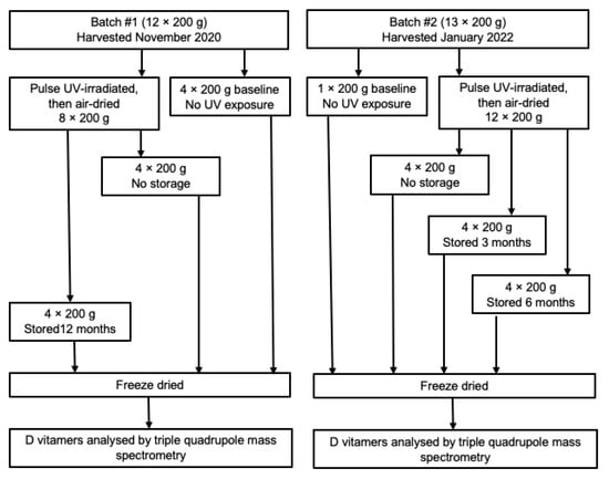 - Cardwell, G.; Bornman, J.F.; James, A.P.; Daly, A.; Strobel, N.; Jakobsen, J.; Black, L.J. Effect of air-drying on the generation of vitamin D2 and 25-hydroxyvitamin D2 by pulsed UV irradiation in button mushroom (Agaricus bisporus). J. Food Compos. Anal. 2023, 115, 105034. [Google Scholar]