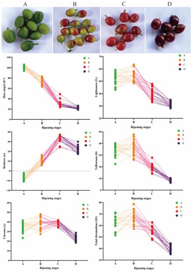 Fruit color indicates maturity level and quality stage and is an essential parameter in fruit classification [19]. As the coffee cherry grows in different stages of maturity, changes in skin color would be observed, and flavor precursors will accumulate. Coffee maturity was divided into A–D ripening stages (Figure 1), and the color of the coffee cherries was presented as green–brown–red–deep red, respectively. Moreover, the values of a, b, c, h°, and (E) demonstrated changes at different ripening stages. Specifically, an “a” value (redness) of −7.37 ± 2.54 was below 0 in the A group, indicating that these samples had a primarily green color. However, the “a” value of group C was 33.43 ± 3.60, suggesting that the coffee cherries ripened from having green skin to red skin. Coffee cherry maturity was attributed to pigments accumulating outside the skin and the changing components in the inner tissue [20].